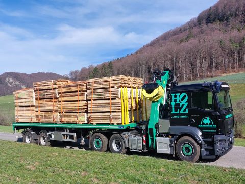 Wir haben in einen neuen Lastwagen investiert. Mit diesem können wir Rundholz und auch Fertigprodukte transportieren.