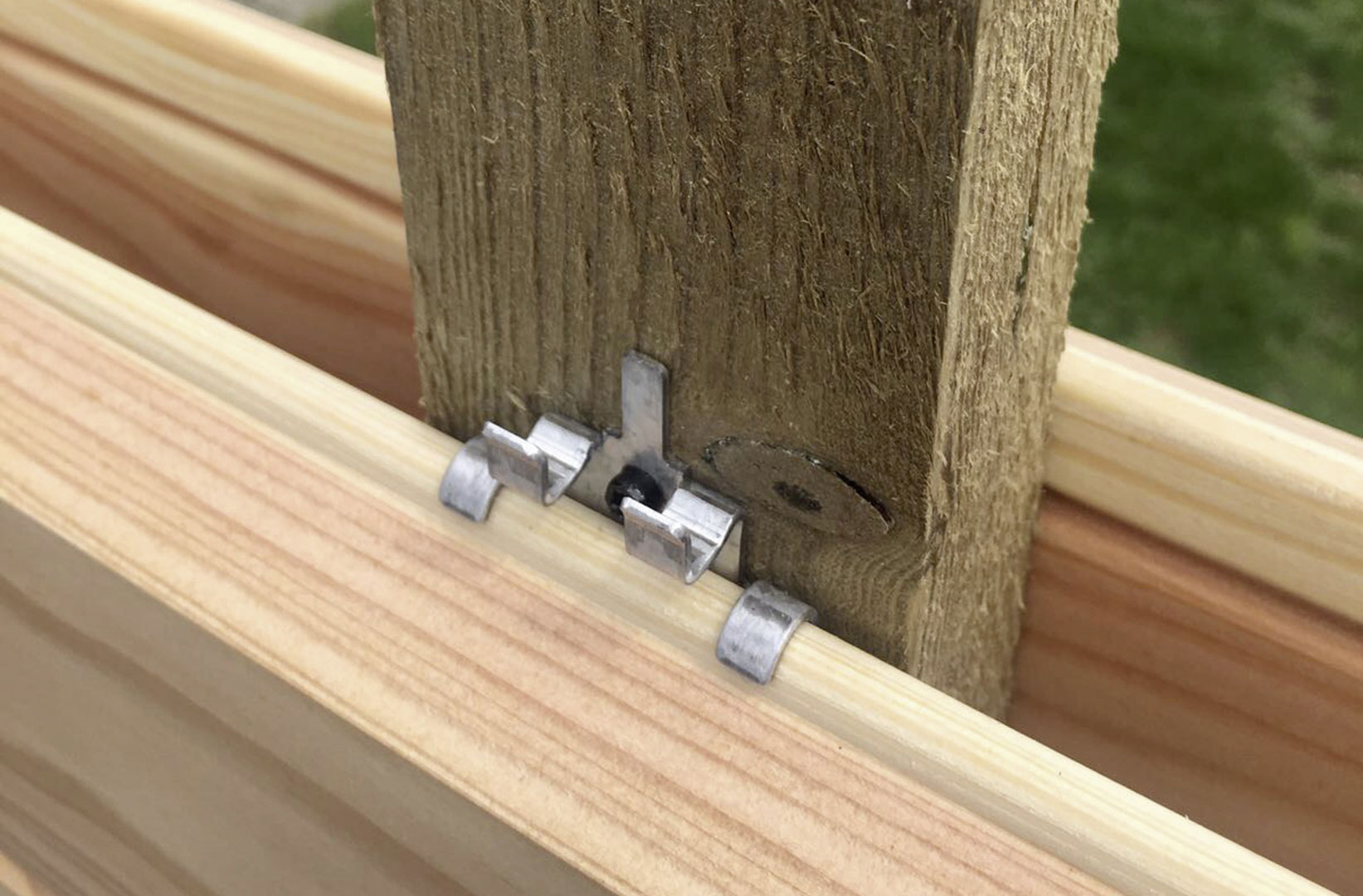 Das clevere System besteht lediglich aus zwei Komponenten: Metallpfosten zum Aufschrauben der Profile und Schweizer Holzlamellen.