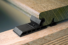 Das Befestigungssystem zeichnet sich durch eine Gleit- und Fixpunktmontage aus: Natürliches Quellen und Schwinden wird optimal und kontrolliert ausgeglichen. Ein frei wählbarer Fugenabstand, angepasst an die Dielenbreite und Eigenschaften des Deckbelags, ergänzt das optisch perfekte Erscheinungsbild Ihrer Terrasse. Die nicht sichtbare Befestigung für die erste und letzte Dielenreihe ist im Verbinder serienmäßig integriert.