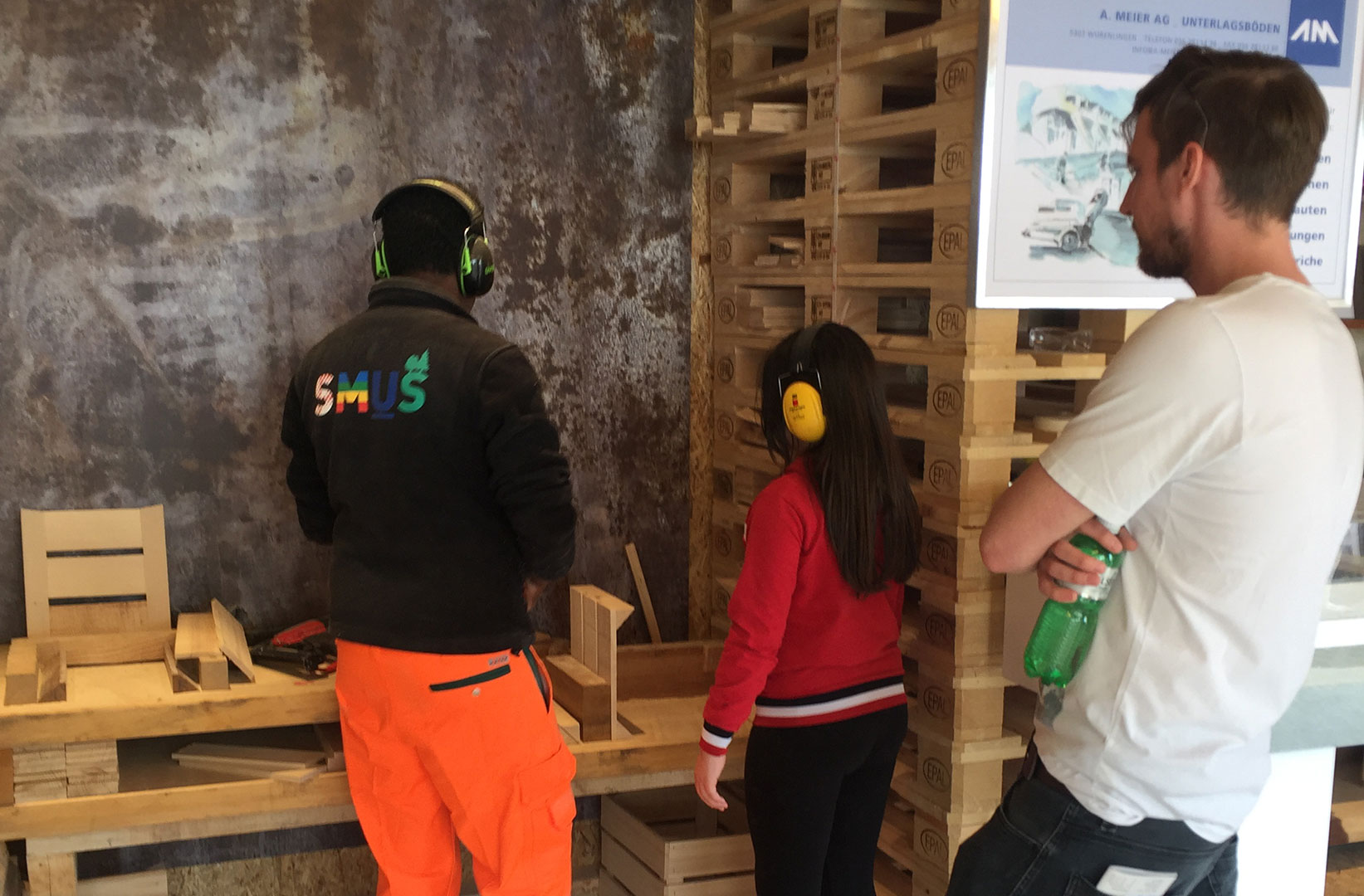 Unter dem Motto SMUS (Strahlen/Schleifen, Malerei, Unterlagsböden, Sägerei) präsentierte sich die Ruedersäge AG vom 12.-15. April an der wüga‘18 auf einem Gemeinschaftsstand zusammen mit der Firma Pan San, der A. Meier AG und der Malerei Pummer.